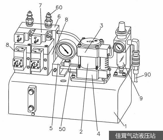 當(dāng)起動(dòng)時(shí),先由氣壓輸入管 90 輸入氣壓,氣壓經(jīng)水氣濾除器 9 濾除空氣中的灰塵、濕氣水分,氣壓可推動(dòng)壓力源缸 2 中的活塞 21、伸縮桿 20 向下動(dòng)作,配合閥座 10 的單向閥 12 鋼珠 14 阻擋油流回油箱 1,從而能夠?qū)⒂蛪翰勘倔w 4 油壓室 40 的油迫出,經(jīng)由其出油孔 15、接頭 50、入油轉(zhuǎn)接座 5,而輸至回路分配控制座 6 供其出油閥 60 輸出,出油閥 60 則連接至欲控制的機(jī)器,該機(jī)器即可有油壓的來(lái)源使用。 然后,控制電磁閥 7使氣壓不輸入,此時(shí)入氣孔 30 不具有輸入的氣壓力,壓力源缸 2 的回復(fù)彈簧 22 可反向推動(dòng)活塞 21 上升,而使氣壓室 32 的氣壓經(jīng)由氣壓輸出孔 31 迫出 ( 入氣孔 30 連接空壓泵,空壓泵本身具有防氣壓倒灌的單向閥 ),而連接至回路分配控制座 6,進(jìn)而使得控制氣控閥 8 動(dòng)作,而控制該機(jī)器所欲控制的功能,同時(shí),在活塞 21 上升的時(shí)候,恰可產(chǎn)生吸汲力,而可汲取油箱 1 中的油再進(jìn)入油壓部本體 4 的油壓室 40 中,提供下一次作用的油源。